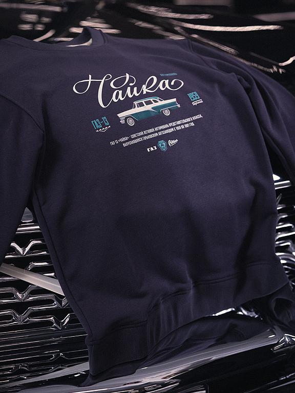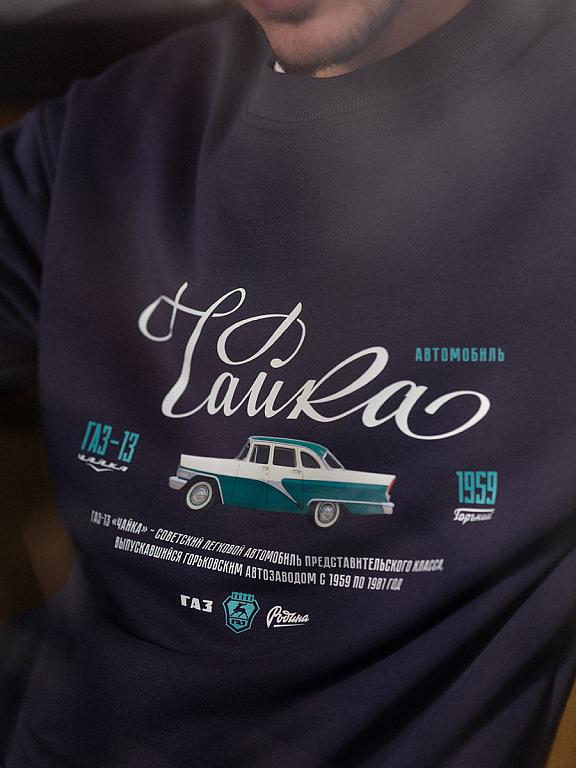 Дизайн свитшота посвящен флагману Горьковского автомобильного завода — модели ГАЗ-13 «Чайка», выпускавшейся с 1959 по 1981 год. Этот автомобиль являлся символом высшего инженерного и представительского класса СССР. Детализированный принт на груди передает характерные черты экстерьера: панорамное остекление, обилие хромированных деталей и стремительный силуэт, вдохновленный «аэростилем».